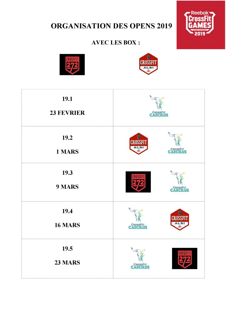 5 semaines intenses nous attendent! Chaque vendredi aura pour WOD du jour le Wod d’OPEN. Pour ceux qui se sont inscris aux OPEN, nous ouvrerons un créneau le samedi après-midi pour retenter le WOD et améliorer son score. Lors de ces occasions, nous nous lierons à d’autres Box pour plus de convivialité!!